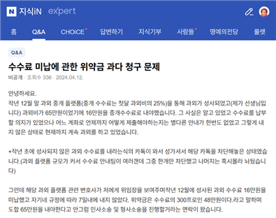 <사진4> ▲ 과외 플랫폼 수수료 미납 위약금 관련 질문 글. 과외 중개 수수료 16만 원을 미납했다가 300% 위약금인 48만 원을 추가로 요구받는 상황이 담겨있다. (출처: 네이버 지식iN)