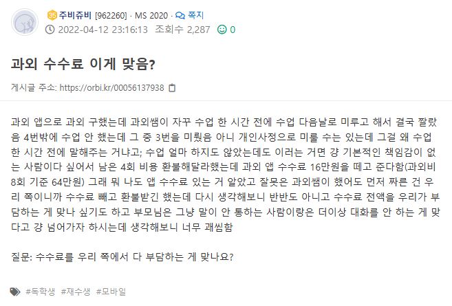 <사진5> ▲ 과외 환급 시 플랫폼 수수료를 학생 측이 부담해야 한다는 내용의 대학생 커뮤니티 글. (출처: 오르비)