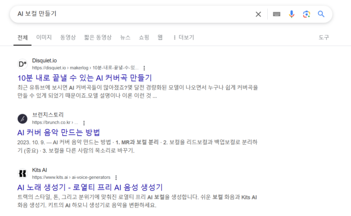 <사진2> ▲’AI 보컬 만들기’ 구글 검색 결과 화면. 일반인도 쉽게 AI를 활용해 커버곡을 만들 수 있다. (출처: Google 캡처)