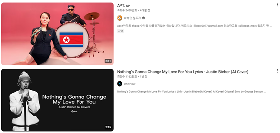 <사진3> ▲ 천만 조회수를 기록한 AI 보컬 커버 영상들. AI 커버곡의 인기를 보여준다. (출처:Youtube 캡처)