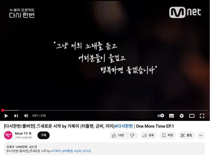김 씨는 특히 “AI가 ‘더 잘 부르는’ 보컬로 소비되는 상황이 반복되면, 인간 보컬리스트가 설 자리가 점점 줄어드는 것 아니냐는 불안이 있다”며 “기술의 발전은 분명 반가운 일이지만, 최소한의 기준과 경계는 필요하다고 생각한다”고 덧붙였다.